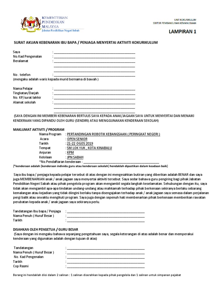 Unit Kokurikulum Surat Akuan Kebenaran Ibu Bapa Dan Penjaga Menyertai Aktiviti Kokurikulum
