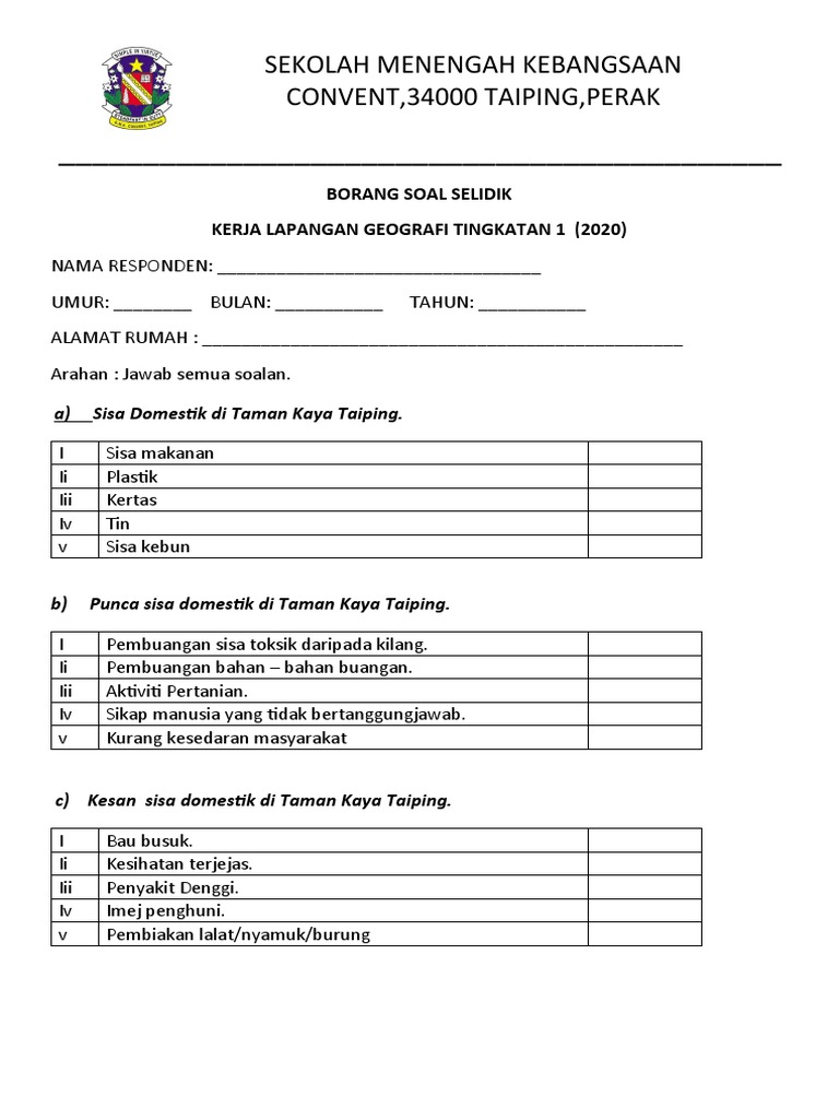 Contoh soalan soal selidik sisa domestik soalan j borang soal selidik docx smk kelana jaya borang soal selidik kerja lapangan geografi tingkatan 1 tahun 2019 tandakan pada ruang yang berkenaan course hero. Contoh borang soal selidik pembuangan sisa domestik borang soal selidik pages 1 6 text version fliphtml5. Bahan rujukan dan contoh via. Kandungan soalan kaji selidik tersebut ialah berkaitan tentang jenis sisa domestik yang terdapat di kawasan kajian kesan pembuangan sisa domestik di kawasan kajian dan cadangan mengatasi kesan tersebut.