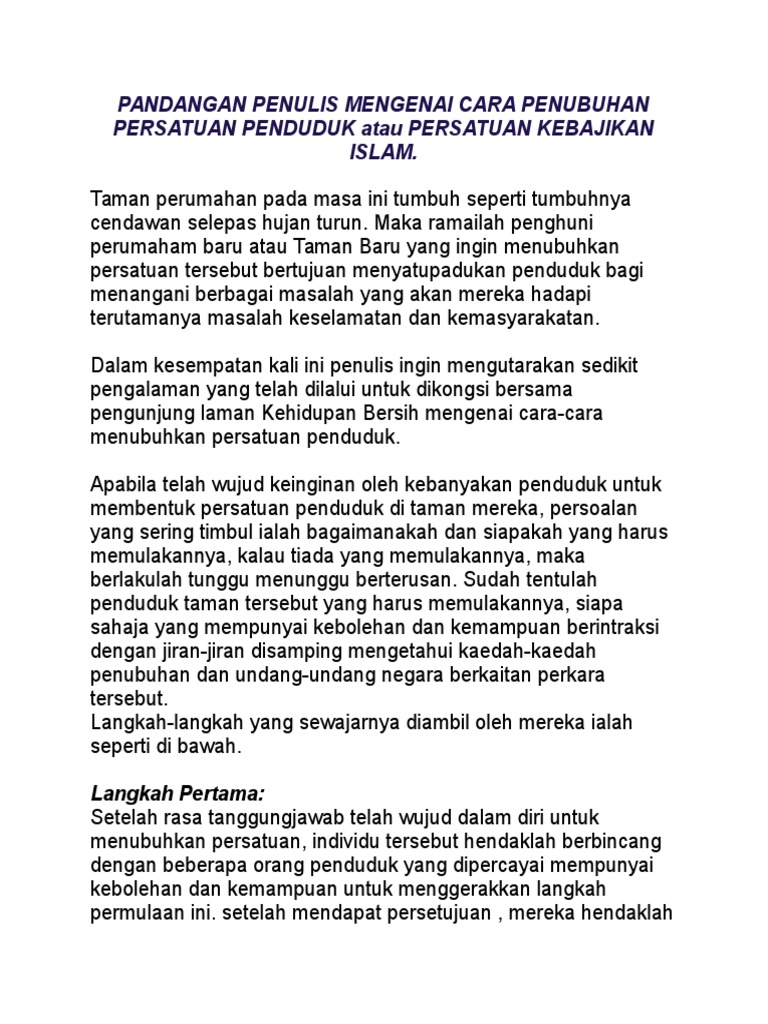 Pandangan Penulis Mengenai Cara Penubuhan Persatuan Penduduk Atau Persatuan Kebajikan Islam