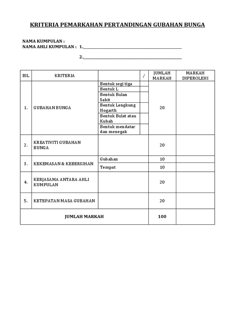Borang Pemarkahan Pertandingan Gubahan Tuala