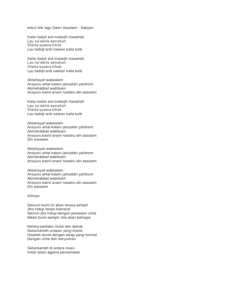 Arsia Lirik Lirik Lagu Deen Assalam Sabyan