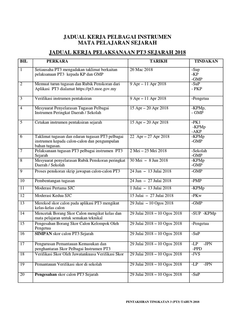 Contoh Jadual Kerja Sejarah Pt3 2018 Senarai Semak Tugasan