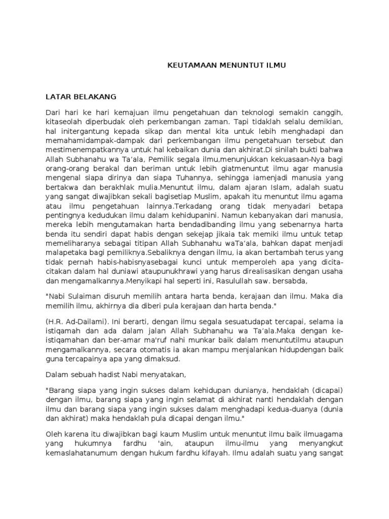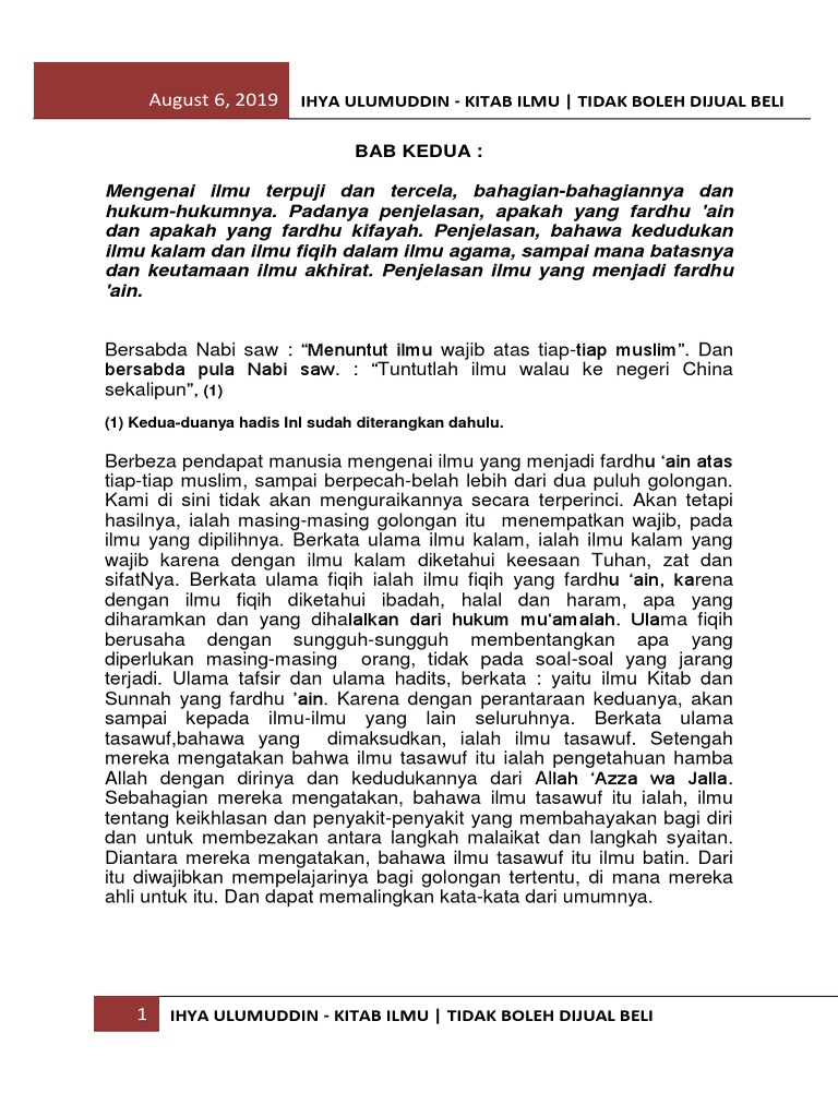 Jelaskan pengertian fardhu ain dan fardhu kifayah dalam menuntut ilmu. Yusuf al qardawi dalam kitab al hillul islami telah menggariskan bidang bidang yang perlu dipandang dan ditangani oleh umat islam sama ada pihak pemerintah mahupun masyarakat dalam proses mengembalikan semula. Adapun ilmu yang bukan ilmu syari at namun dibutuhkan untuk tegaknya urusan dunia seperti kedokteran dan matematika maka ini termasuk ilmu fardhu kifayah juga 6. Menuntut ilmu itu wajib ke atas tiap tiap muslimin dan muslimat. Dari segi istilah ia membawa maksud kewajipan yang difardhukan ke atas seluruh umat islam dengan tujuan untuk menegakkan agama islam seperti menuntut ilmu al quran ilmu hadith menyempurnakan jenazah dan mengajak kepada amar ma ruf nahi mungkar.