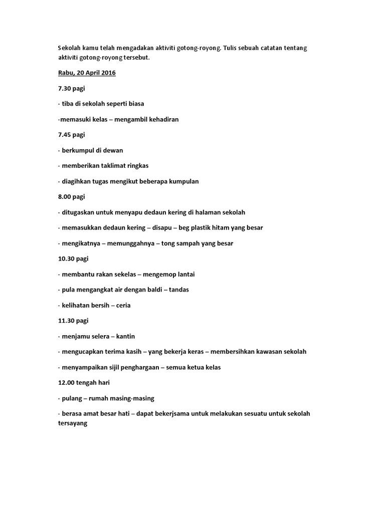 Karangan gotong royong di kawasan perumahan. Impaknya dengan melaksanakan aktiviti aktiviti berfaedah seperti ini akan membawa anjakan paradigma bukan sahaja kepada kawasan perumahan malah kepada kesihatan anggota masyarakat itu sekali. Kebiasaanya amalan gotong royong ini selalunya dapat dilihat di kawasan luar bandar dan jarang. Pengalaman menghadiri gotong royong ceritakan pengalaman kamu menghadiri kegiatan gotong royong di kawasan perumahan kamu. Definisi gotong royong istilah gotong royong adalah berasal dari negara indonesia.
