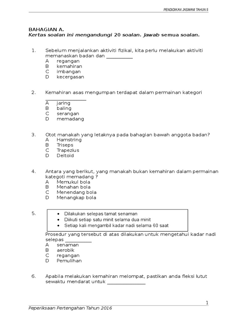 Soalan Ujian Bulanan Pendidikan Jasmani Dan Kesihatan Tahun 5 Sekolah Rendah Doc