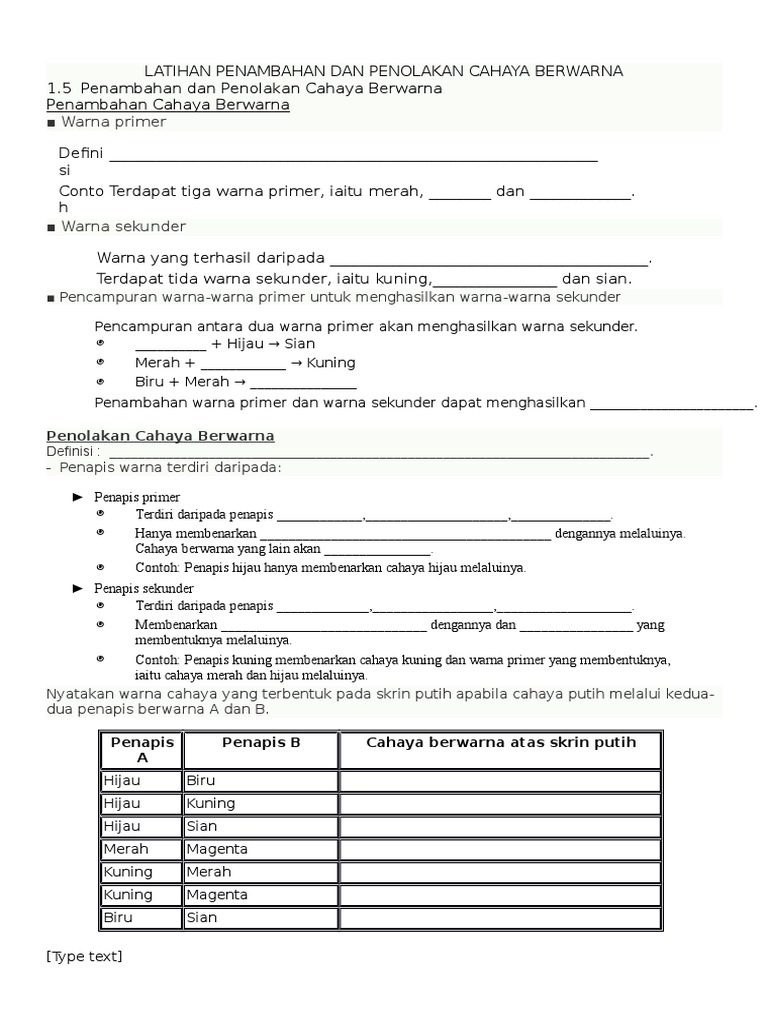 Latihan Penambahan Dan Penolakan Cahaya Docx Document