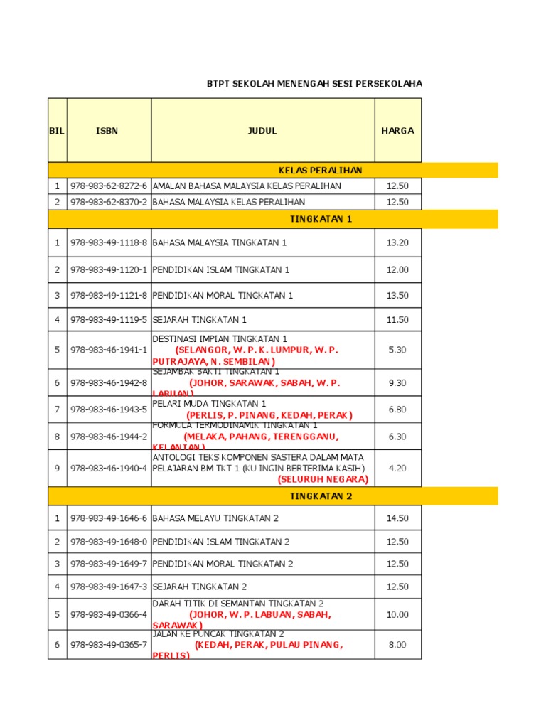 Senarai Harga Buku Teks Tingkatan 1
