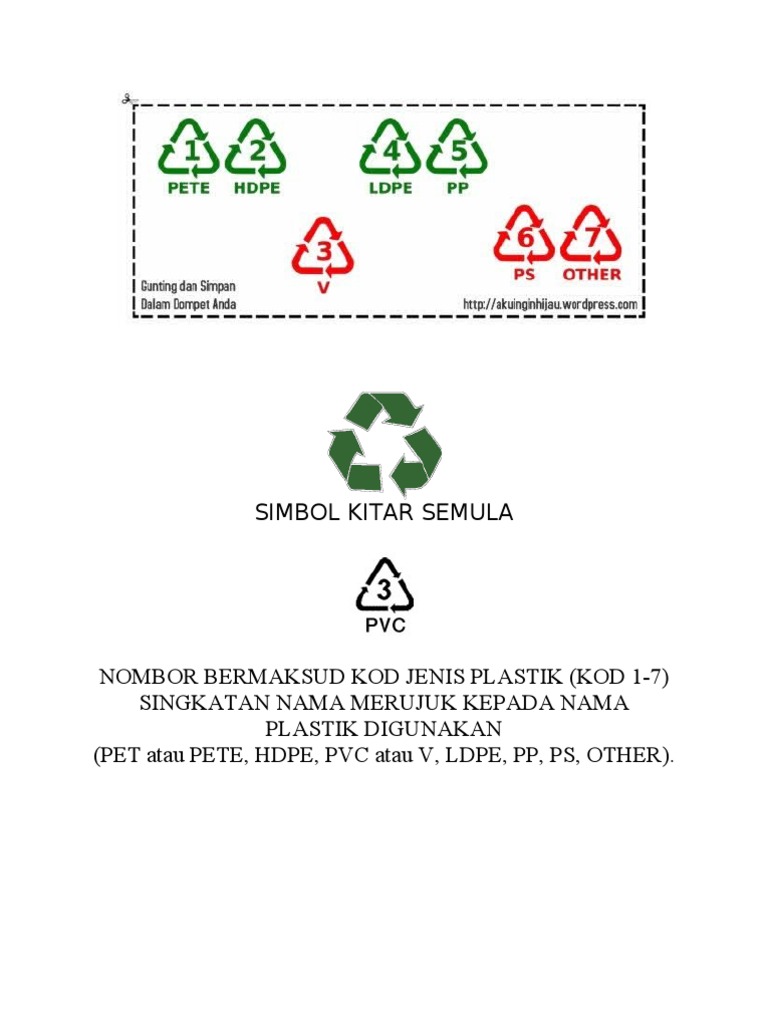 Sebenarnya kegunaan bilangan nombor tersebut adalah sebagai satu indikator kepada kita dalam memberitahu bahan kimia apakah yang digunakan dalam menghasilkan botol plastik tersebut. Peralatan makmal apa perlu anda buat a. Jadi amatlah penting bagi kita semua mengetahui dan memahami kod kitar semula yang dilampirkan di bahagian bawah produk plastik tersebut. Bekas cat dan bahan toksik c.