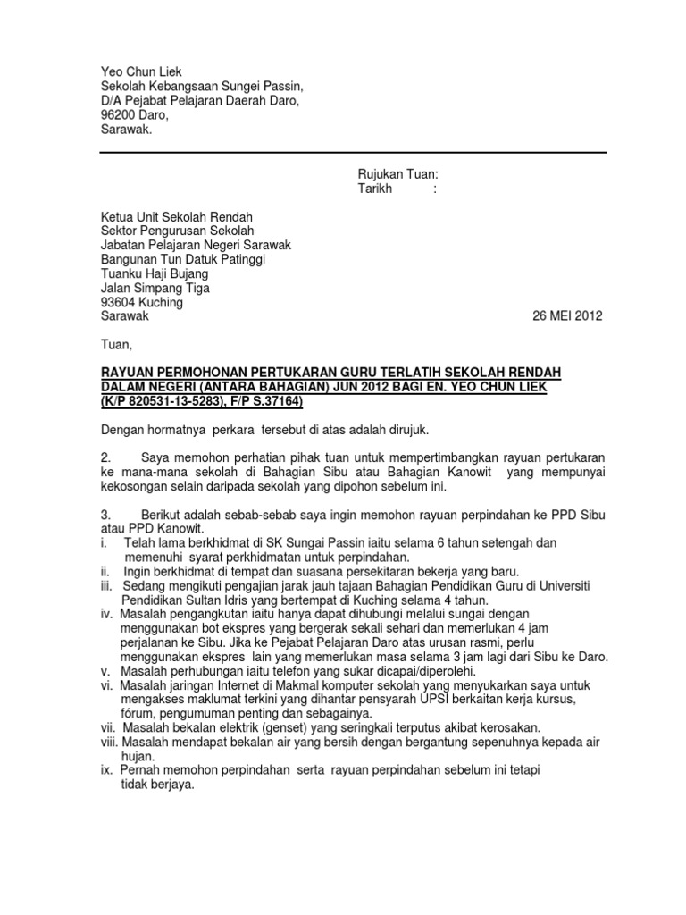 Contoh Surat Rayuan Pertukaran Guru Egtukar Docx